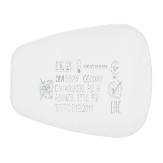 De 3M 5925 is een P2 R deeltjesinlegfilter dat wordt gebruikt in combinatie met 3M gas- en dampfilters uit de 6000-serie en de 3M filterhouder 501 of filteradapter 603. Het hoogwaardig vezelfiltermedium met elektrostatische lading biedt een efficiënte filtratie van fijnstof, nevel en rook, terwijl de ademweerstand laag blijft. Daardoor kunnen medewerkers het masker lange tijd dragen zonder onnodige vermoeidheid.