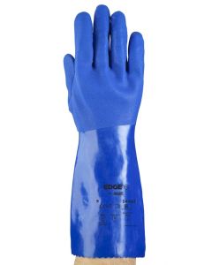 De Ansell EDGE® 14-663 is een volledig PVC-gecoate werkhandschoen voor middelzware tot zware industriële toepassingen. De handschoen combineert chemische bestendigheid (oliën, vetten, zuren, logen en oplosmiddelen) met betrouwbare mechanische bescherming volgens EN 388:2016 (3121A; snijniveau A). De ruwe antislipafwerking levert zekere grip in natte en geoliede omstandigheden, terwijl de zachte katoenen binnenvoering langdurig comfort biedt—ook in koelere omgevingen. De 360 mm lengte en rechte kapmanchet beschermen hand en onderarm en maken snel aan- en uittrekken mogelijk.