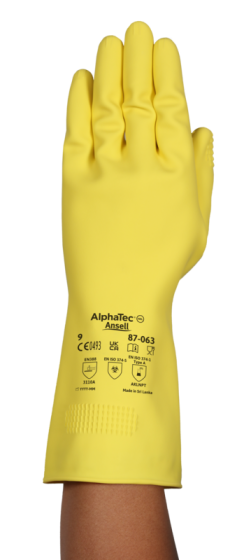 De Ansell AlphaTec 87-063 handschoenen zijn duurzame natuurrubberen latexhandschoenen met katoenvlokvoering. Ze bieden betrouwbare bescherming tegen chemische stoffen, mechanische risico’s en zijn geschikt voor contact met levensmiddelen; conform EN ISO 21420:2020, EN 388:2016 +A1:2018 (3110A), EN ISO 374-1:2016 Type A (AKLNPT) en EN ISO 374-5:2016.