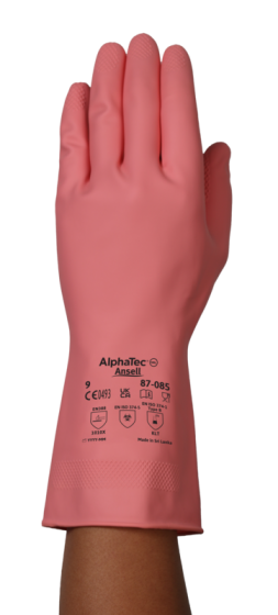 De AlphaTec 87-085 is ontwikkeld voor taken waarbij comfort en chemische basisbescherming essentieel zijn. De handschoenen zijn vervaardigd uit natuurlijke rubberlatex en hebben een voering van 100% katoenvlok, die zorgt voor soepelheid, vochtabsorptie en verhoogd draagcomfort.