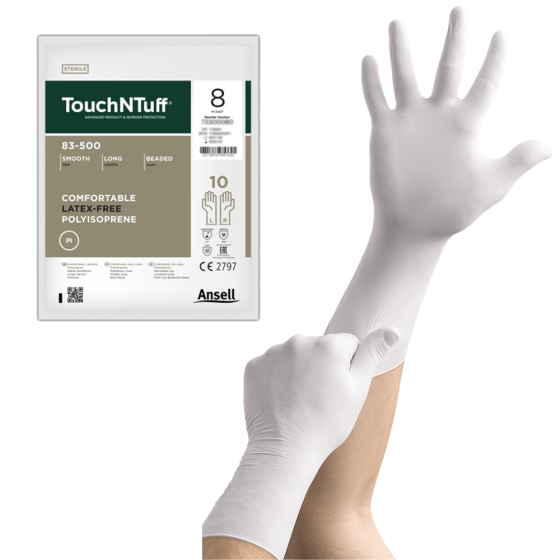 De Ansell TouchNTuff 83-500 handschoenen zijn steriele cleanroom wegwerphandschoenen van zacht polyisopreen. Ze combineren een “tweede huid”-gevoel met optimale bescherming, latexvrij ontwerp en gammasterilisatie voor een steriliteitsniveau (SAL) van 10⁻⁶; conform EN ISO 21420:2020, EN ISO 374-1:2016 Type B (KPT), EN ISO 374-5:2016, EN 421:2010 en EN 556-1:2001.